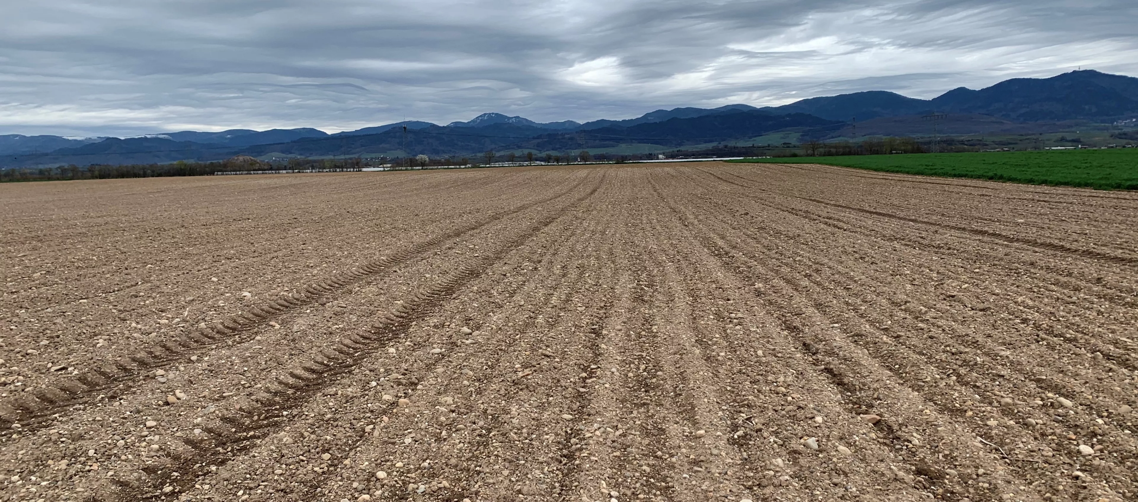 Hinter einer ausgedehnten, ebenen, unbewachsenen Ackerfläche mit sehr viel hellem Kies an der Oberfläche sieht man im Hintergrund ein bewaldetes hohes Bergland und einen dunklen wolkenverhangenen Himmel.