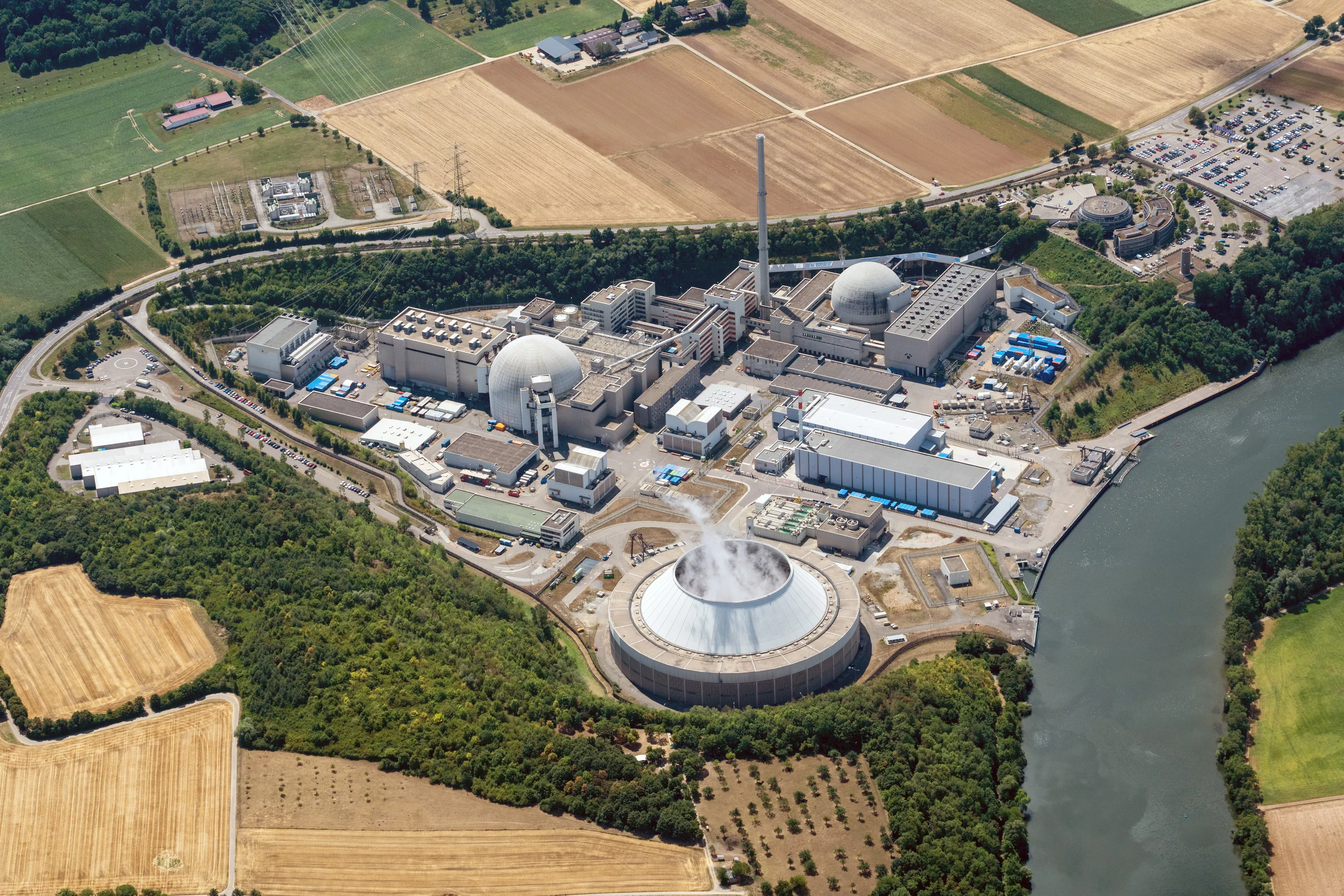 Blick auf einen Gebäudekomplex unter blauem Himmel und leichter Bewölkung. Am linken Bildrand ist ein Kühlturm zu erkennen, aus dem Dampf aufsteigt. Im Bildvordergrund zeichnen sich ein schmales Waldstück, Wiesen und Felder sowie ein bewaldeter Hügel ab. Im Bildhintergrund sind weitere flache bewaldete Hügel sowie Strommasten zu erkennen.